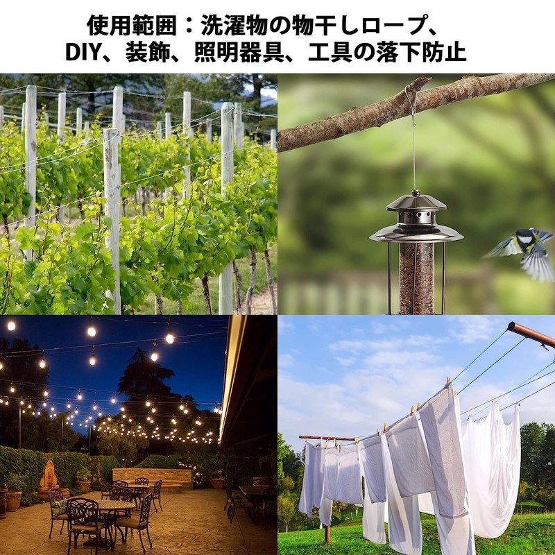 - Range of usage: This wire rope can be used for bundling a variety of items, hanging, and making rings. It is widely used in a variety of fields such as agriculture, gardening, forestering, fishing, industrial, transportation, home, typhoon fixing, earthquake measurements, decorations, crafts, DIY, etc. Water and rust resistant, can be used indoors or outdoors. Rust resistant properties are superior compared to iron in saltwater. Also great for outdoor activities such as typhoons, preventing tree and furniture from falling, preventing tools from falling off, and protective fences. A good choice for hanging tools