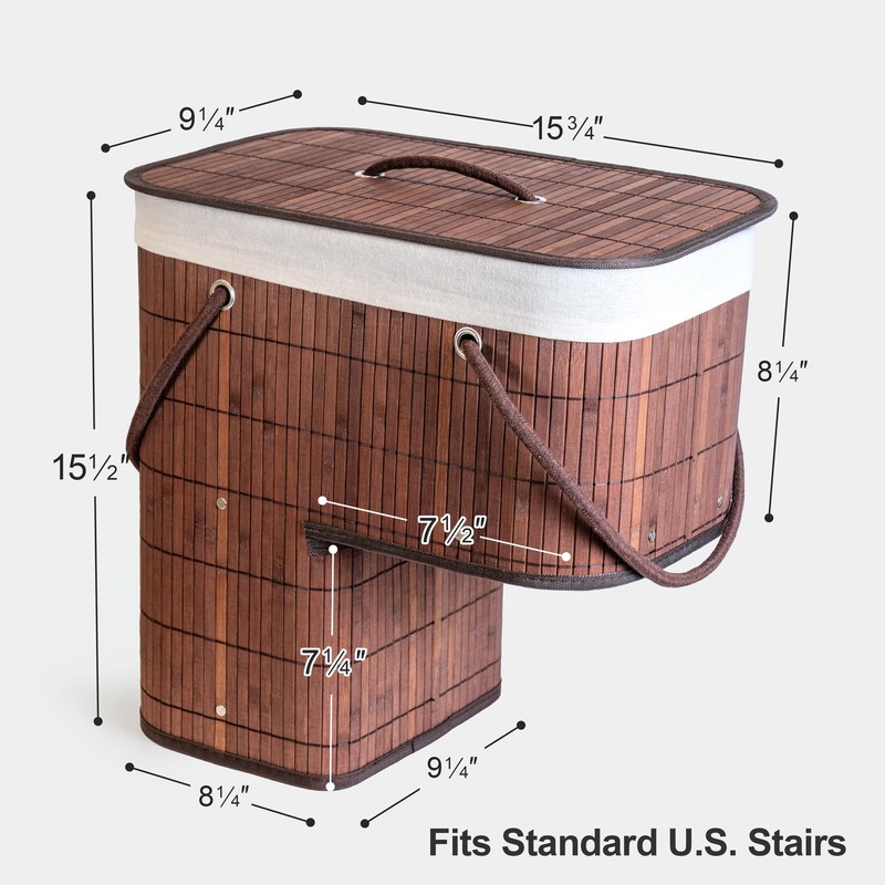 Tired of clutter on your stairs? Our bamboo stair basket offers a large dual-compartment design to neatly organize household items. Made from sustainable bamboo, it's durable, eco-friendly, and stylish. The removable fabric liner is machine washable, while the built-in handles ensure easy transport up and down the stairs. The lid keeps dust away and conceals mess, making your home look effortlessly tidy. Anti-slip base protects your stairs from scratches, and the foldable design allows for compact storage when not in use.