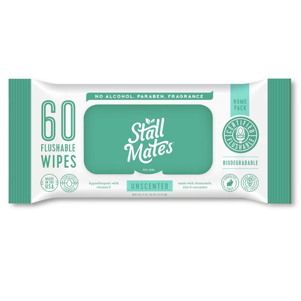 Stall Mates 60-Wipe Home Pack: Flushable and Hypoallergenic Moist Wipes Made in the USA. Unscented with Vitamin-E & Aloe, 100% Biodegradable