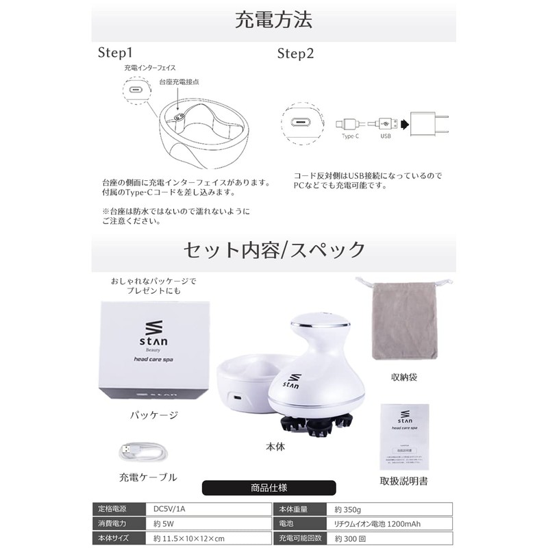 stan ヘッドスパ 電動頭皮ブラシ EMS 防水 IPX7 軽量 コードレス 頭皮ケア スカルプケア ギフト プレゼント (ホワイト)