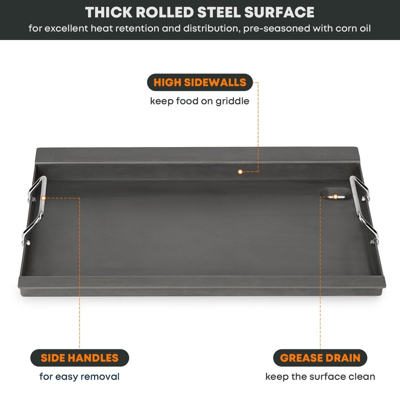 - Heavy-duty steel for durability and pre-seasoned cooking surface saves prep time