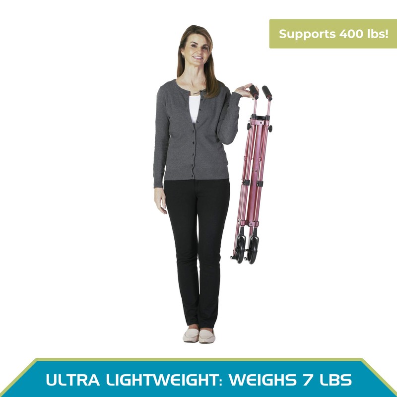 Stander Wonder Walker, Lightweight Foldable Space Saver Rolling Walker for Adults, Seniors, and Elderly, Compact Travel Walker with 6-inch Wheels and Ski Glides for Mobility Support, Regal Rose