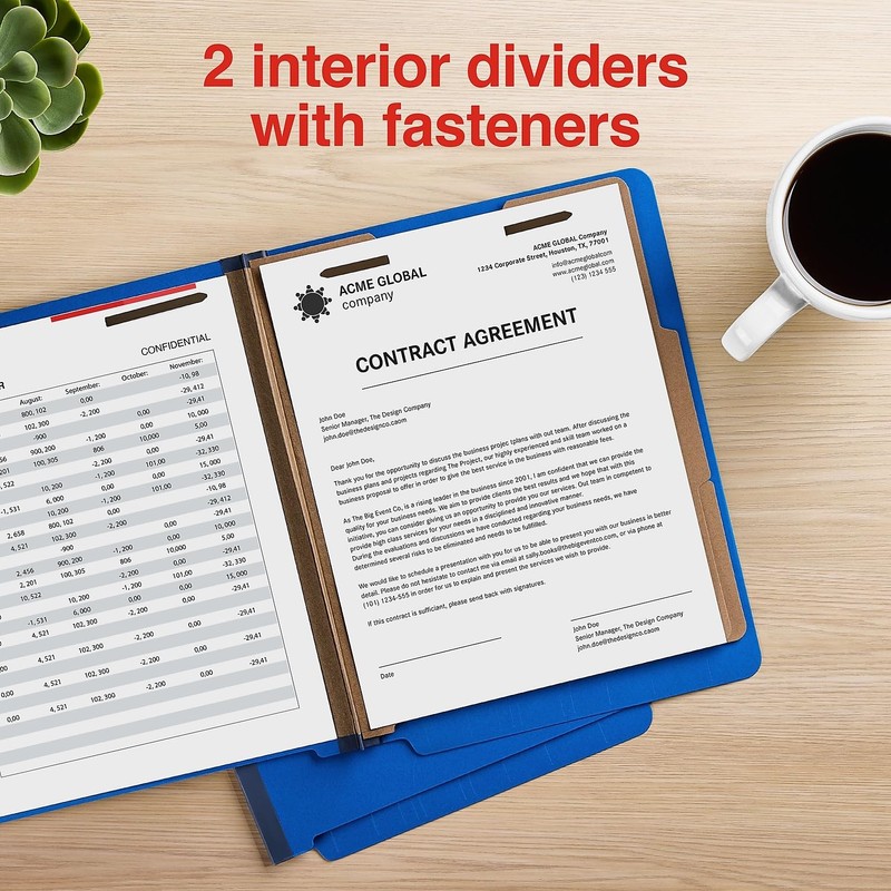 Keep documents organized with the Staples 60% Recycled End Tab Classification Folders with fasteners/nGet organized in an eco-friendly fashion with these Staples 60% End Tab Classification Folders. These letter-sized folders are made from a minimum of 60% recycled material and crafted from sturdy 25-point pressboard. Each extra-durable folder gives you a wide 2-inch expansion and tear-resistant gussets. Two dividers are equipped with six SafeSHIELD fasteners on both sides, so you can securely store and manage more documents. The straight-cut tabs let you label easily, and the stylish dark blue adds a sophisticated splash of color to your workspace. Each box contains 10 folders and comes in an eco-friendly chipboard box with a color label.