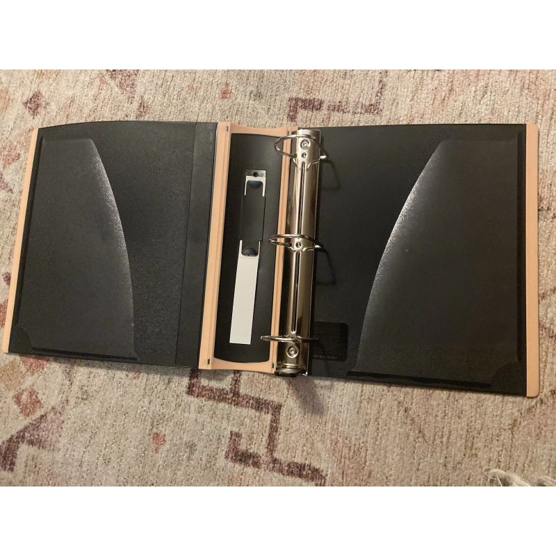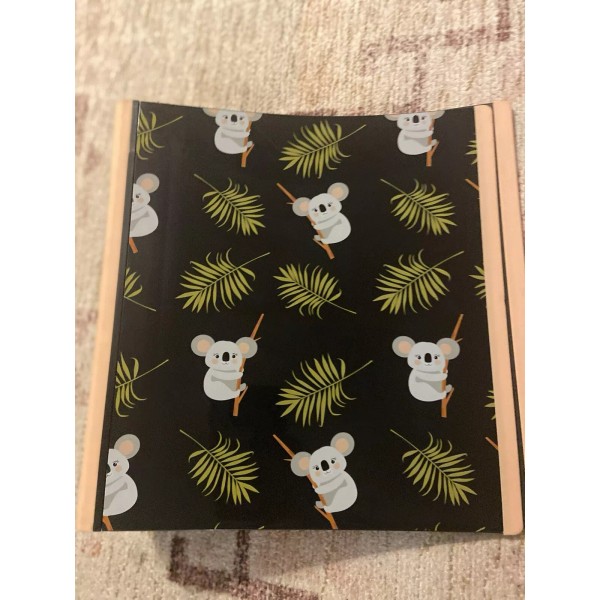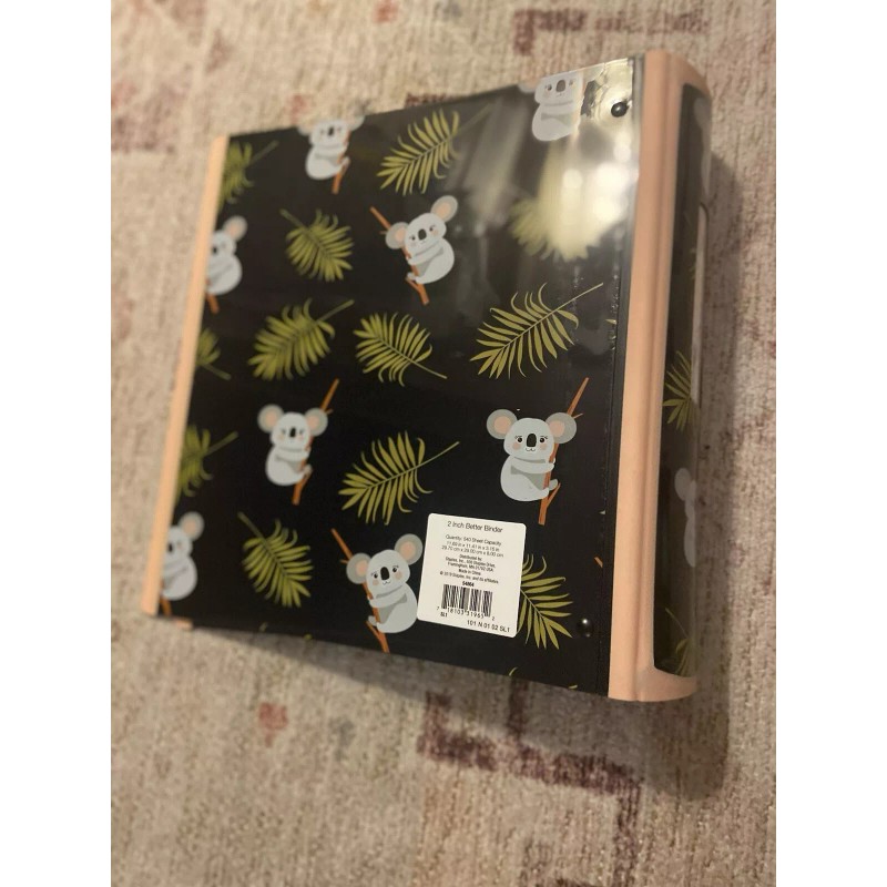 This is brand new Fir Real Staple Better Binder 2 inch binder, hold 540 sheets, size : 11.69 in x 11.41in x 3.15 in . the design is a koala bear with leaves and the color is dark blue. Has two inside pockets, three ring binder, easy to open.