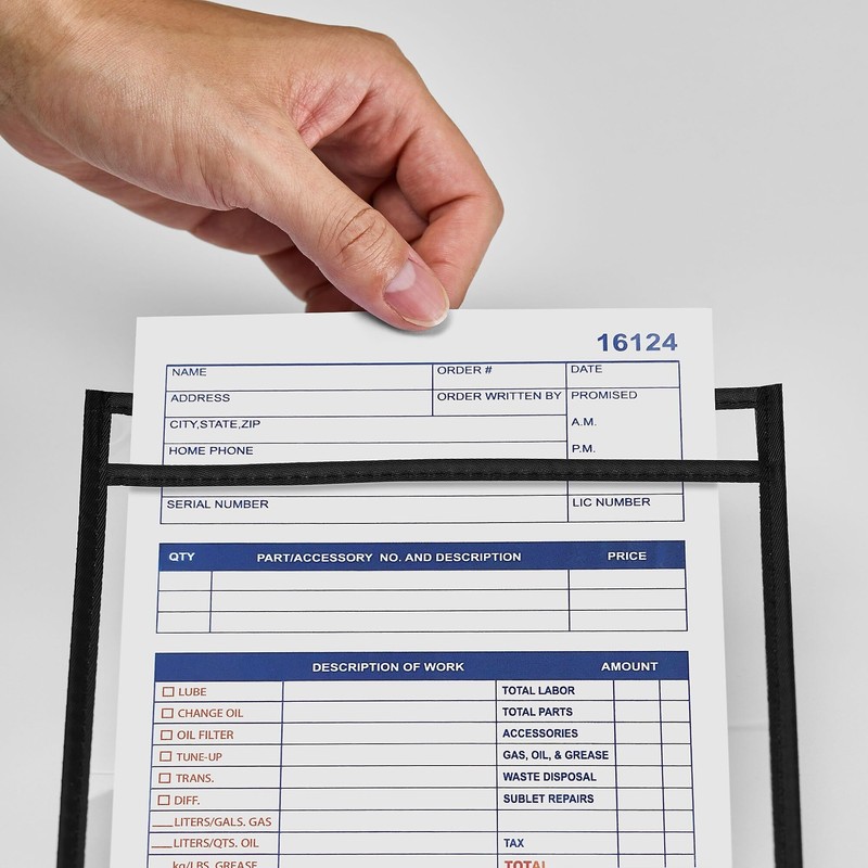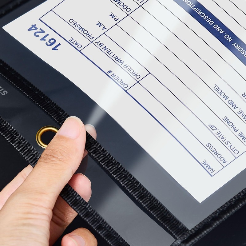 - Stitched job ticket holder is perfect for storing and protecting work orders, production schedules, inventory cards, restaurant menus, and more. Convenient, reinforced eyelet at top for easy hanging.