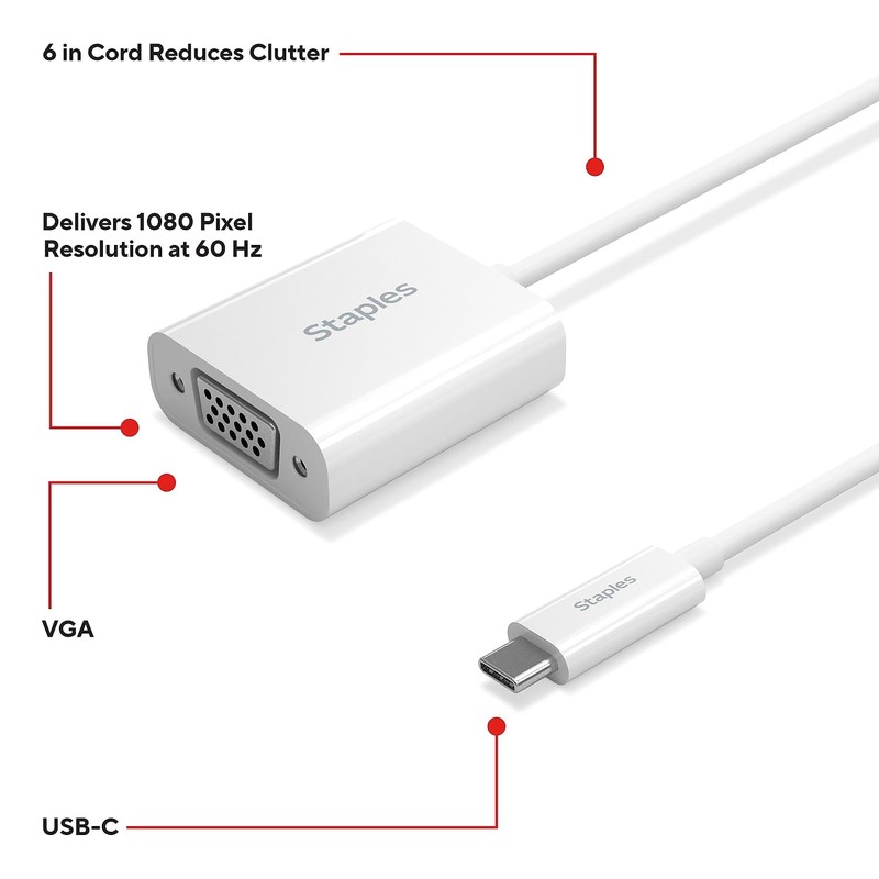 - Extend your display with sharp, high-resolution visuals using the Staples TECH USB-C to VGA Adapter