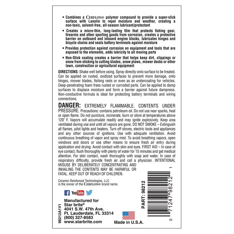 - Specs: Size: 11.75. Can be applied to all metal parts to prevent grass, dirt, hay, snow, ice, dirt and more from adhering. Forms a micro-thin film that "seals" The treated surface for long-lasting lubrication and protection against corrosion. Cerflon® nanoparticles bond to treated surfaces for long-lasting lubricity of all metal moving parts.