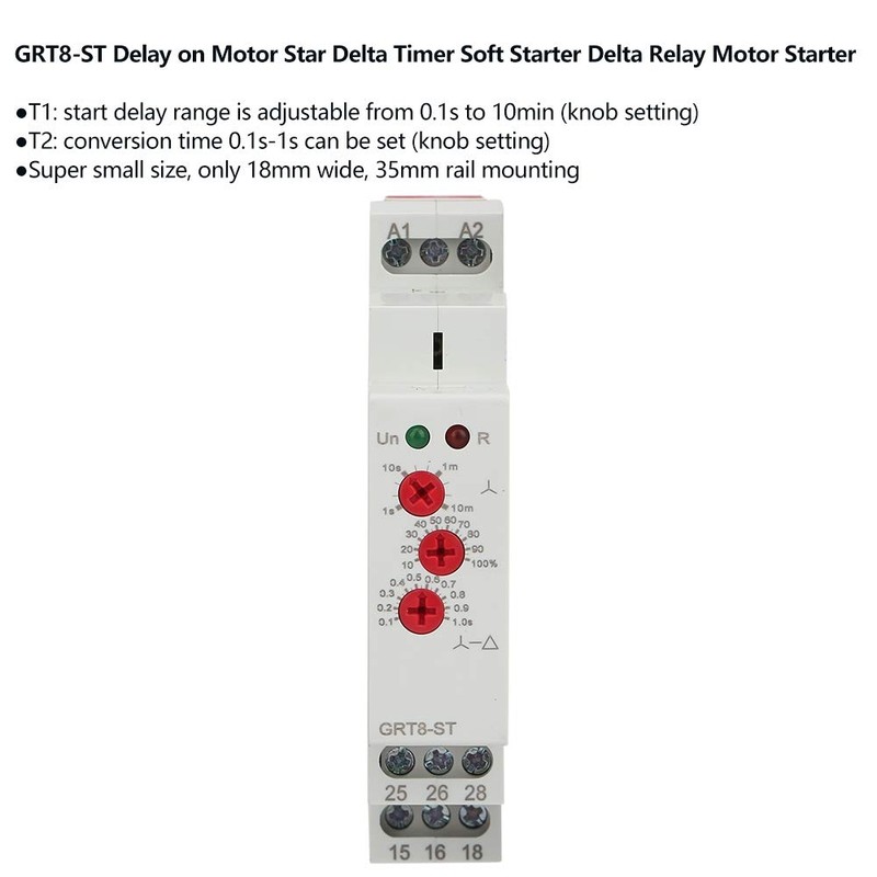 T1: start delay range is adjustable from 0.1s to 10min (knob setting) T2: conversion time 0.1s-1s can be set (knob setting) With AC/DC 12~240V wide working voltage specification optional The working status of relay is indicated by LED indicator light. Super small size, only 18mm wide, 35mm rail mounting Application: designed for star delta motor start control