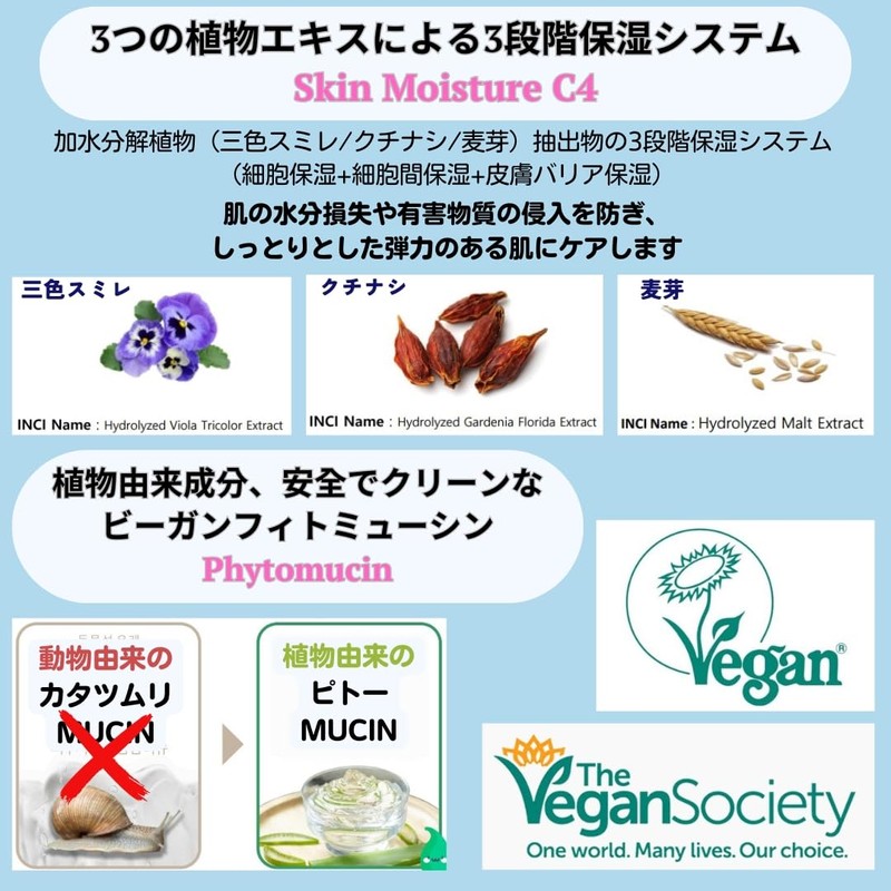 - Includes a 3-stage moisturizing system with 3 plant extracts: Tricolor Violet, Gardenia and Malt, and Phytomucin with vegetable-based ingredients derived from okra and aloe