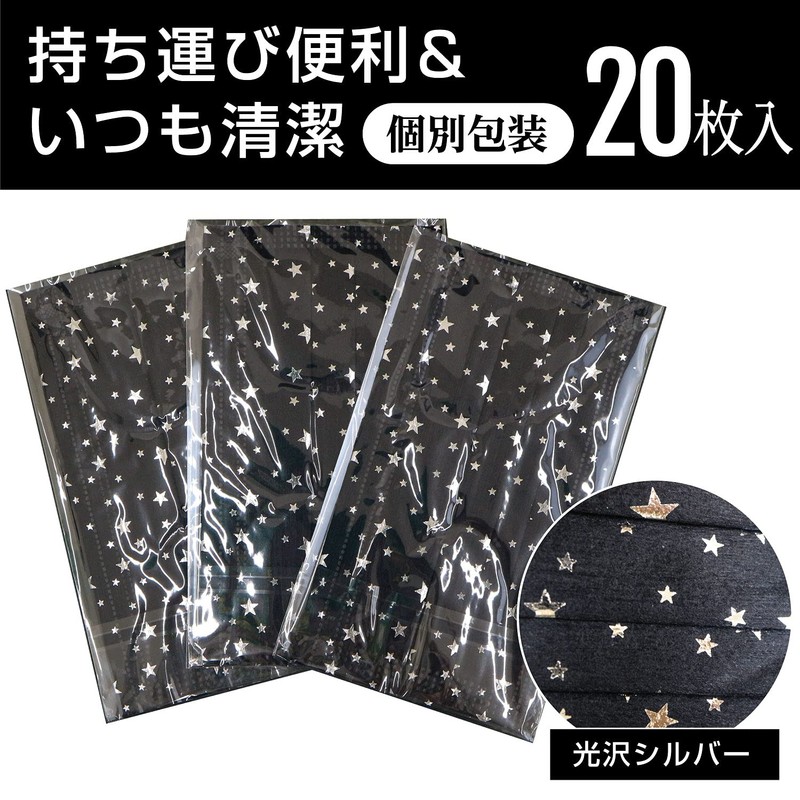 Star Pattern Black Mask, Sparkly Silver, 5 Layers, Non-Woven Mask, Unisex, Individually Wrapped Over PFE99% (20 Pieces)