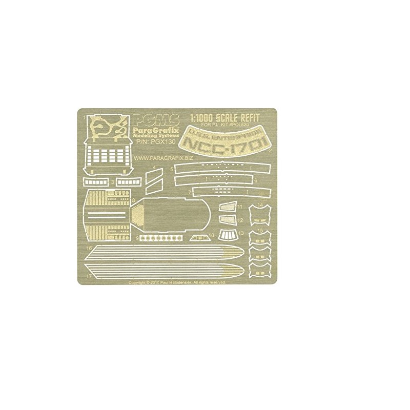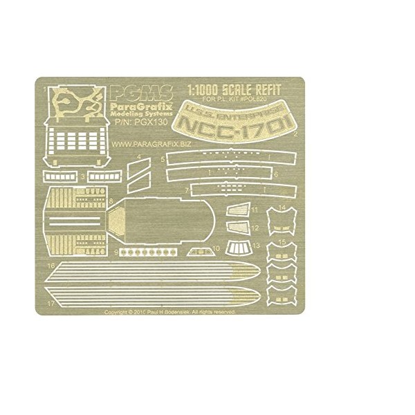 Star Trek Refit Enterprise (1:1000 scale) Model Kit Photoetch Set. Photoetched from 0.005 (0.13mm) thick bright brass, this set includes: -All docking ports -Shuttle bay -Arboretum & window frames-Officers lounge window frames-Impulse engine grills-Warp engine grills-Planetary sensor covers to make lighting easier*-Drilling guides for saucer edge windows-Nameplate for stand-Suitable for lighting*-Detailed, fully illustrated instructions. *Electronics not included. For Polar Lights kit number POL820.