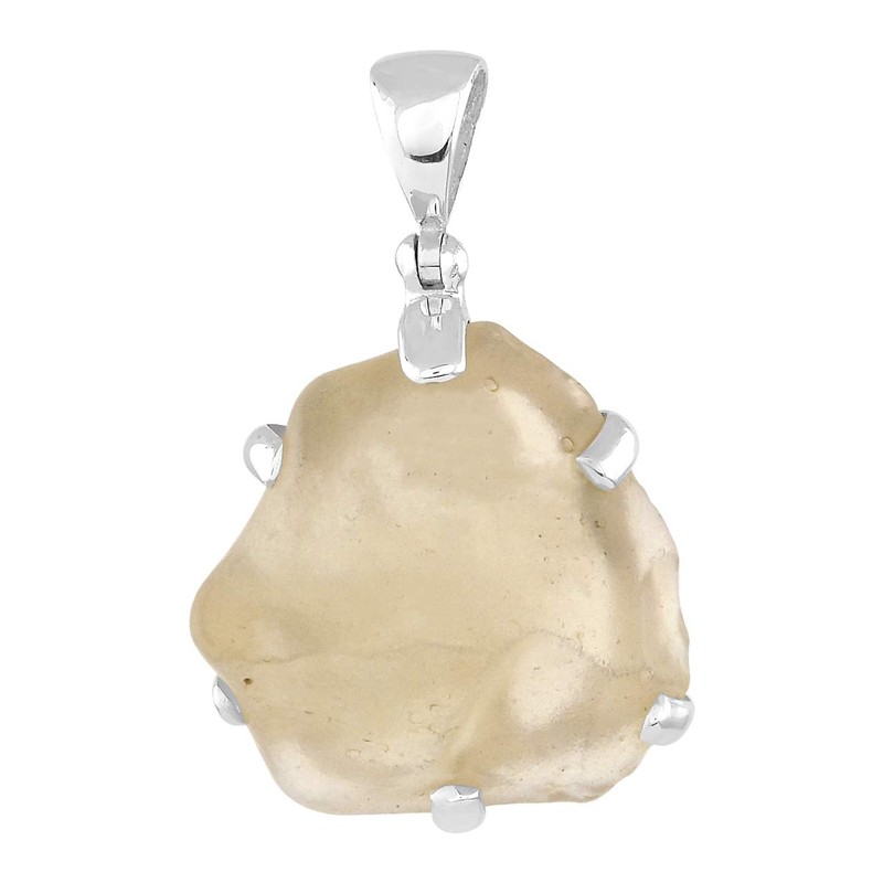 - Handcrafted Libyan Desert Glass pendant elegantly prong set in fine Sterling Silver. With hand selected 10-15 carat Libyan Desert Glass Tektite. Overall pendant length is about 1.00 to 1.25 inches long (including bale) by .65 inch wide.