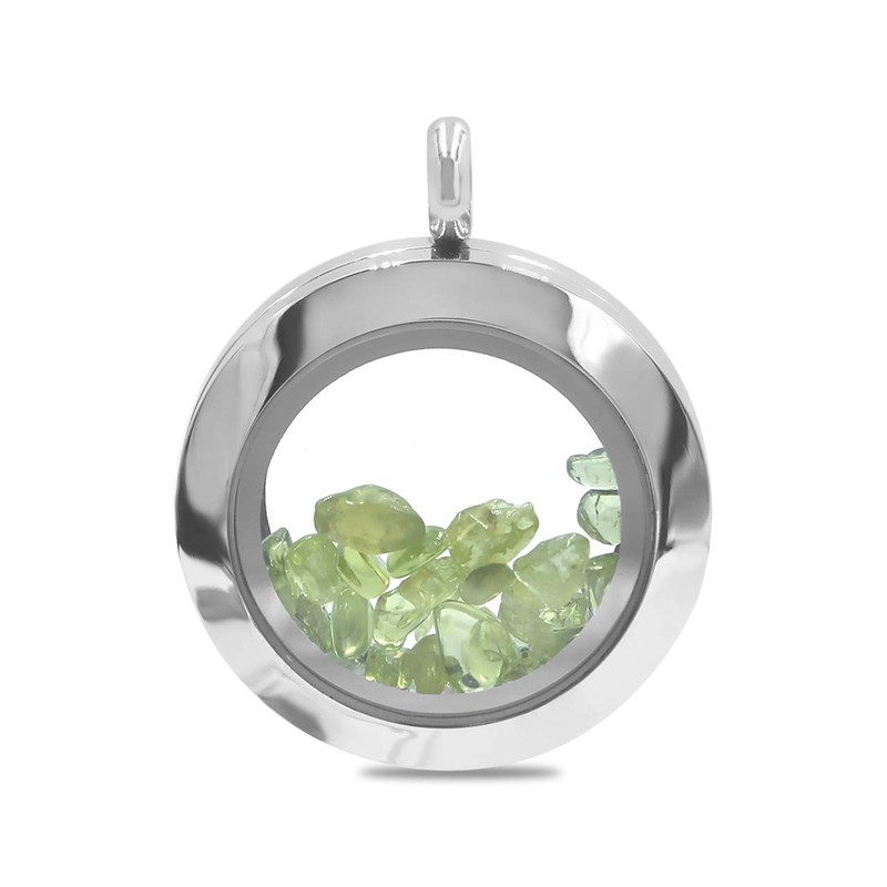 • Genuine tumbled peridot gemstones in a sleek and durable stainless steel locket with clear lenses.