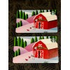 RED BARN DECORATED FOR CHRISTMAS SURROUNDED BY CHICKENS