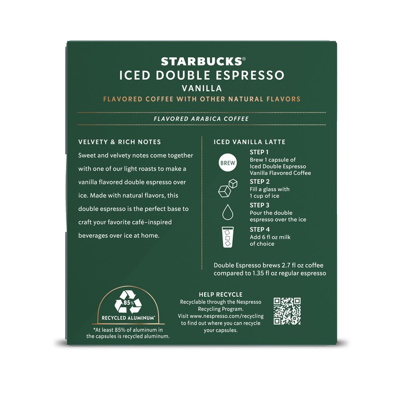 - STARBUCKS BY NESPRESSO PODS: Enjoy the Starbucks coffee you know and love with these four 8-count boxes of Starbucks Iced Double Espresso Vanilla capsules for Nespresso Vertuo machines—32 capsules total