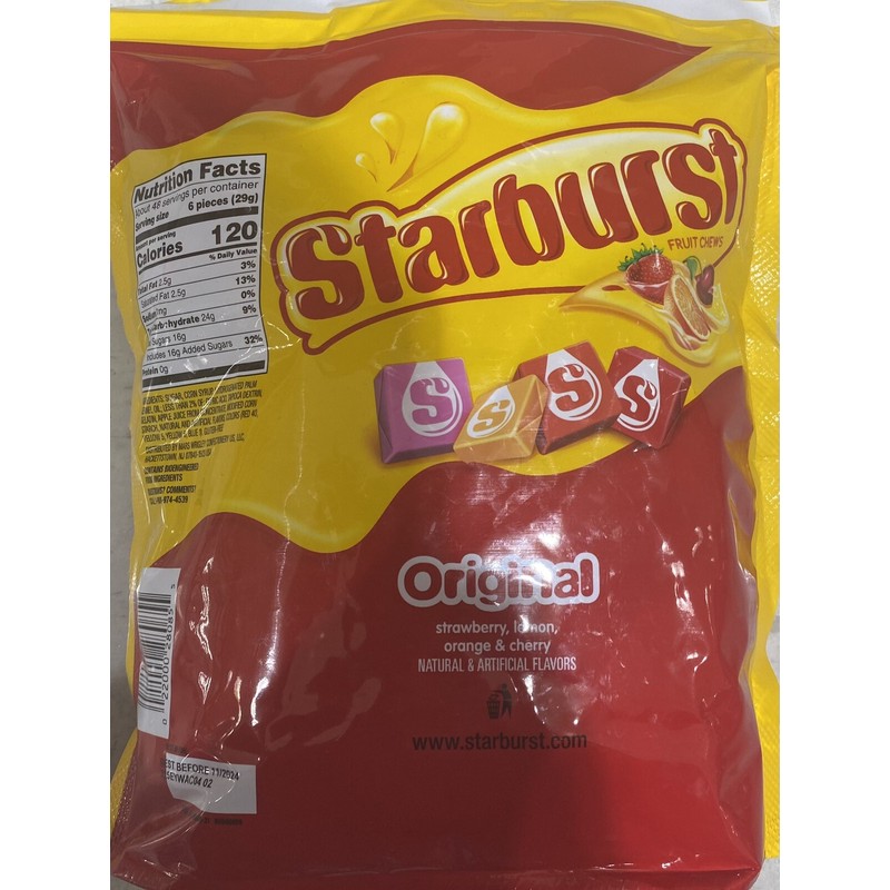 Hello Here we have a listing for ( 1 ) BRAND NEW - Factory Sealed - Never Opened "FRESH"Starburst Fruit Chews Candy Party Size Resealable Bag 50 oz Please know this before you purchase! Cherry - Orange - Strawberry - Lemon **DISCLAIMER** ** PLEASE UNDERSTAND IF YOU LIVE IN A STATE THAT IS WEATHER CHALLENGED, CERTAIN FOOD ITEMS ARE SENSITIVE TO THAT AND MAY MELT / FREEZE *** PLEASE MAKE SURE YOU AWARE OF THIS BEFORE PURCHASING** **DISCLAIMER** ** BUY MORE AND SAVE , WITH MY QTY DISCOUNT PRICING ** Product detailsEnjoy your favorite fruity candy with enough to share with everyone. STARBURST Original Fruit Chew Candies are individually wrapped, making it easy to take these fruity treat on the go. Each party size pack of STARBURST Candies is perfect for stocking the office pantry, celebrating birthdays or sharing on game night. With STARBURST Original Fruit Chew Candy, there are endless ways to add a burst of unexplainably juicy flavor every day. This party size pack includes all the STARBURST Original Candy fruit flavors you love: strawberry, cherry, orange, and lemon.