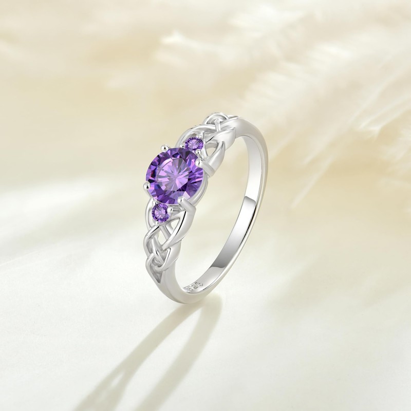 - This celtic knot ring set with 2 pieces 2mm and 1 piece 6mm round-brilliant-cut AAAAA created amethyst.