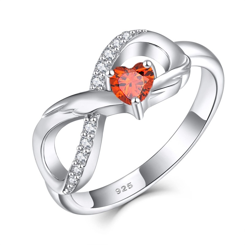 - Material: Angel Wings Heart Infinity Ring. Made of 925 sterling silver and rhodium plated . Setting with 10 AAA cubic zirconia stones and a 4 mm heart-shaped Created Garnet