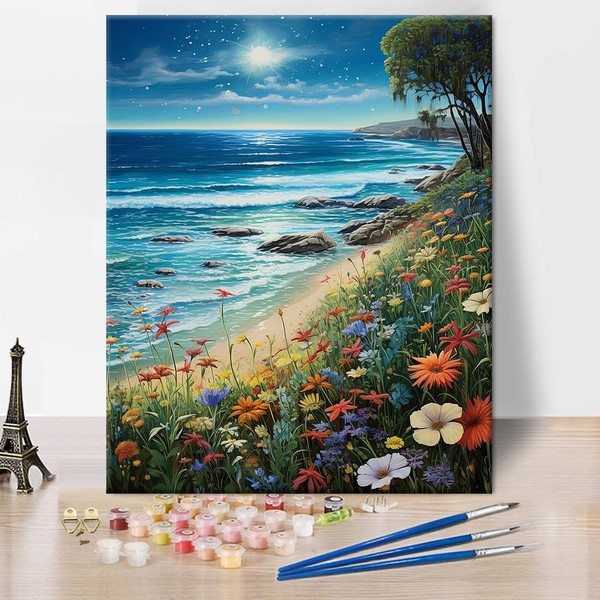 Stardust Beach Garden DIY Paint by Numbers Kit for Adults Enchanted Coastal Flora Scene Paint by Numbers Night Beach Paint by Numbers Kit Acrylic Painting Oil Painting Art Crafts 16"x20"(Frameless)