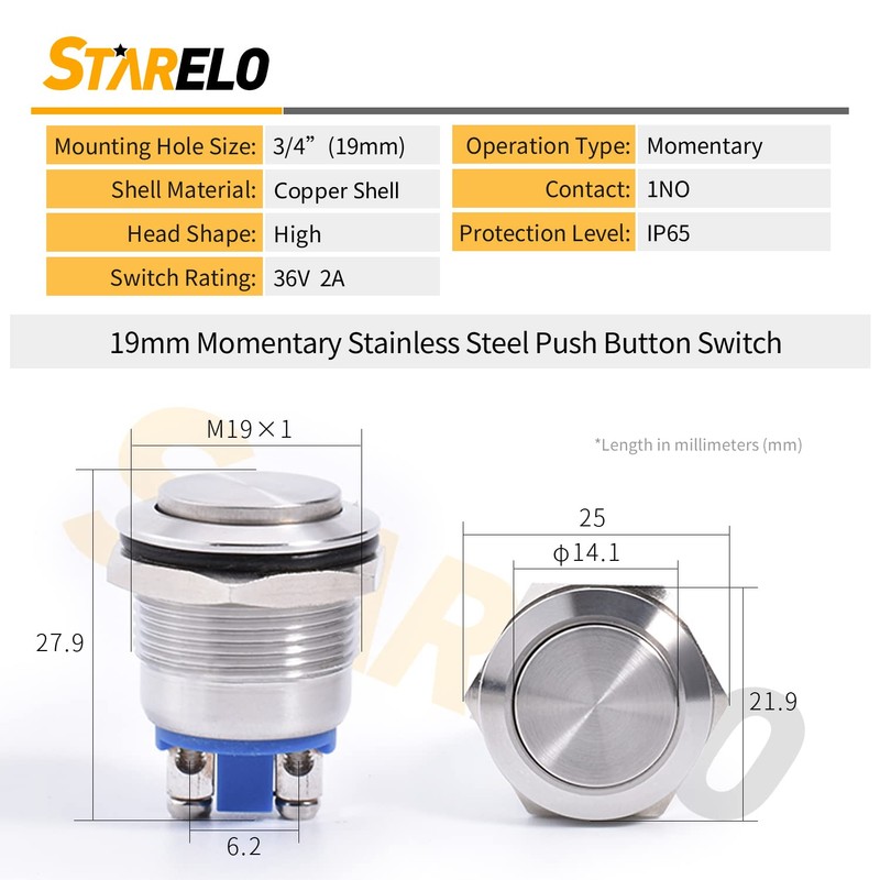 STARELO 19MM 3/4" Momentary Push Button Switch High Round 250V AC 5A 12V 36V DC 2A 1NO SPST Waterproof Copper Shell(Sliver).