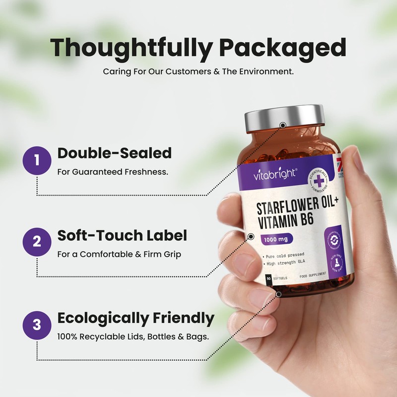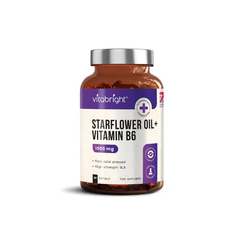Starflower Oil / Borage Oil Capsules - 1000mg - High Strength GLA - with Vitamin B6 for Regulation of Hormonal Activity - 90 Softgels (3 Month Supply) - Pure & Cold Pressed - Made in UK by VitaBright