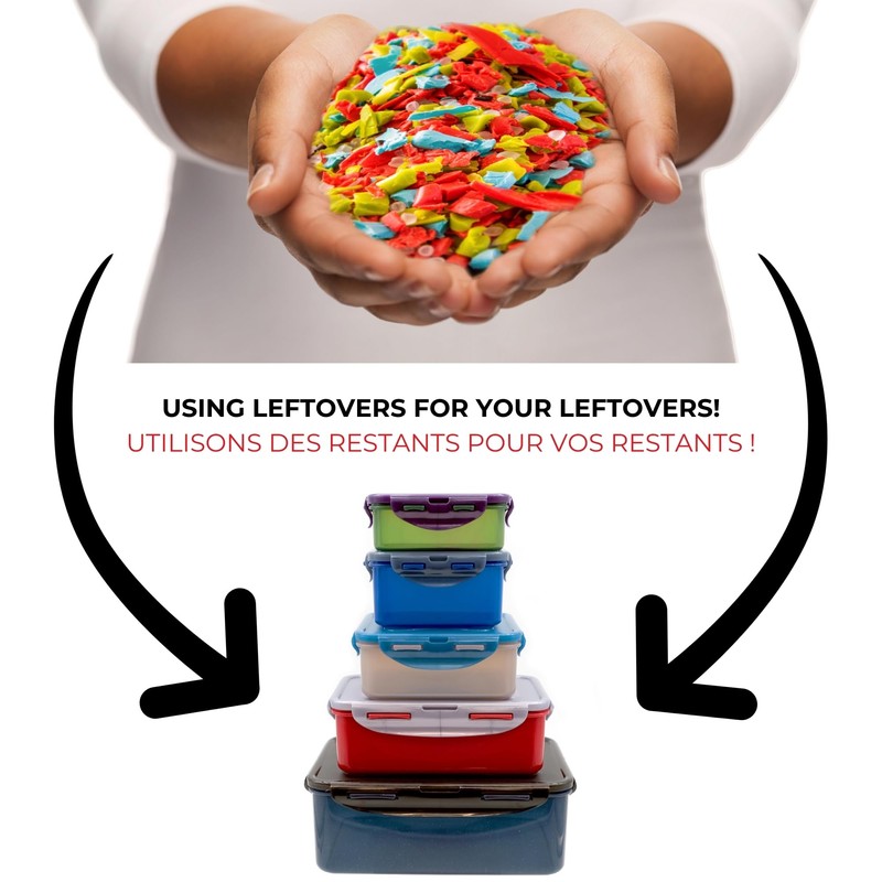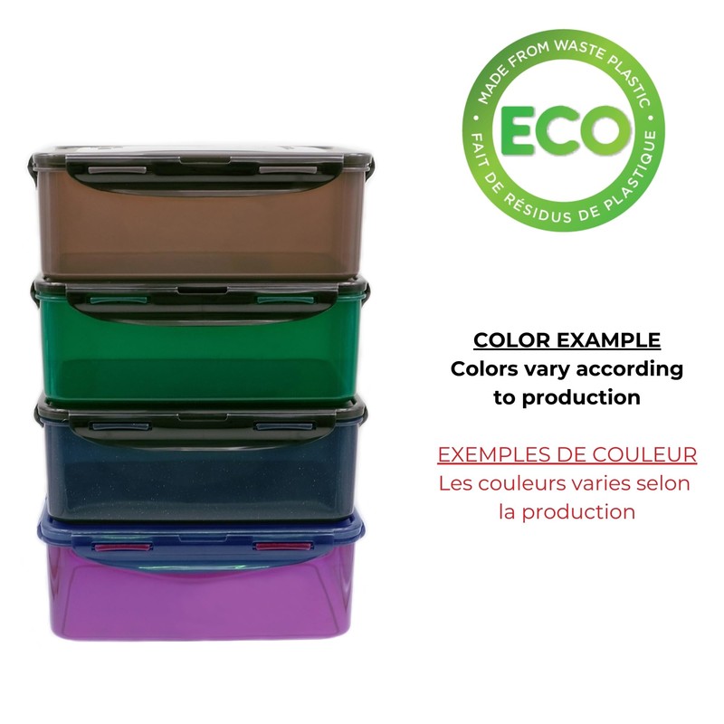 - ECO food storage containers are made of off-cuts, trims, production over-runs and other surplus plastic that would normally be thrown away. Turning waste plastic into food storage containers!
