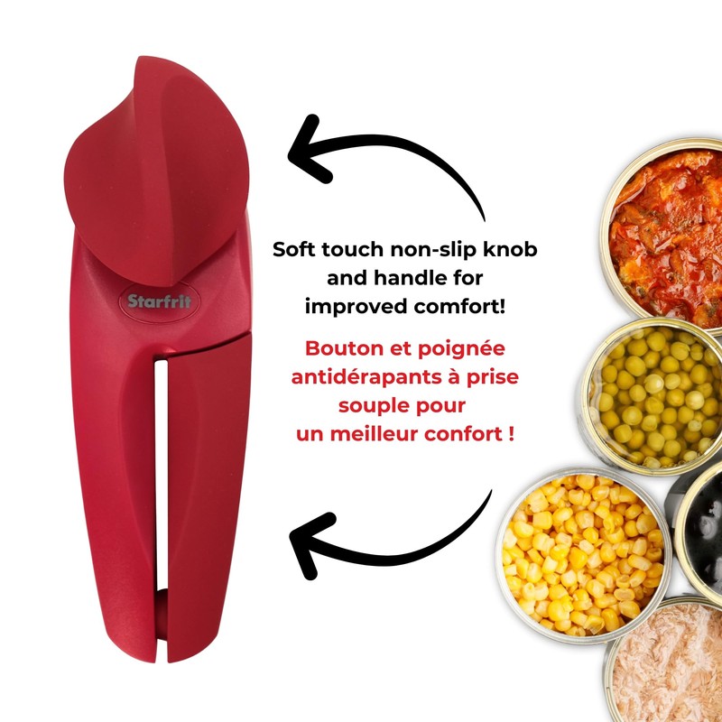 Starfrit MightiCan Can Opener - Safe - Holds Lid and Leaves No Sharp Edges on Lid - 3 Year Warranty - Comfort Grip - Heavy Duty Non-Slip Knob - Red