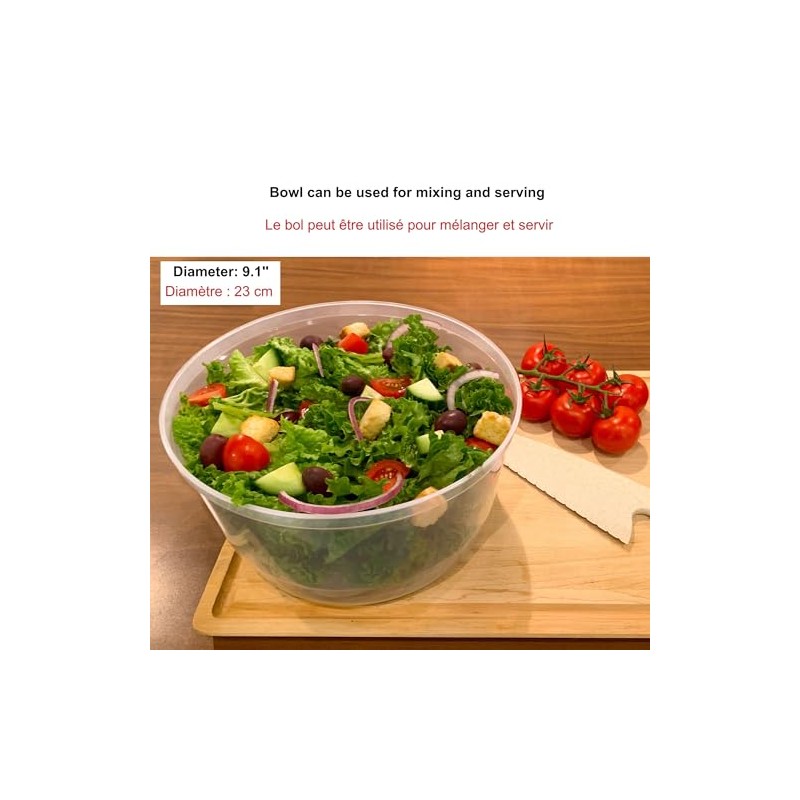 - Transparent base doubles as a salad bowl for mixing and serving
