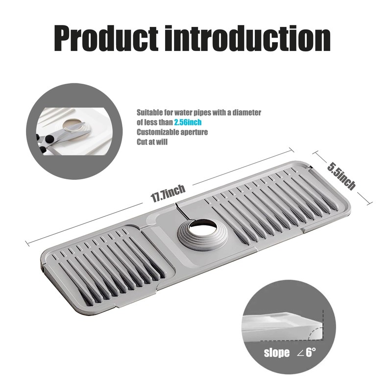 1. Adjustable size: this silicone faucet mat for kitchen sink, Its adjustable hole design (2.5"-2.75") fits most standard faucets, including those in RVs and farmhouse sinks. the corresponding hole diameter can be trimmed according to the faucet size