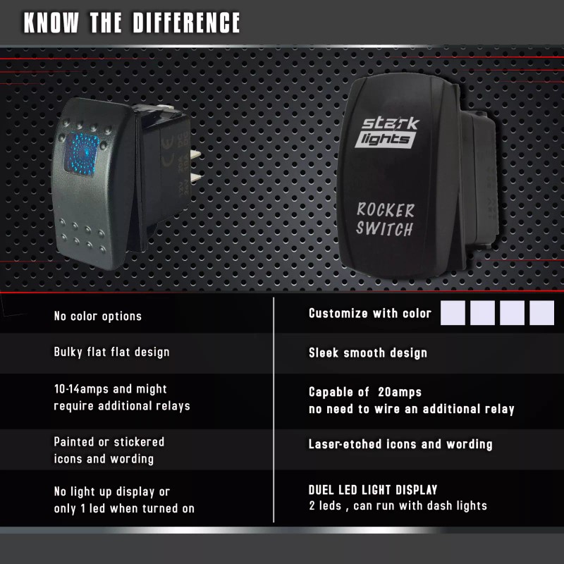 LED Rocker Switch 5-Pin 20 Amp 12 Volt - On / Off LED Rocker Switch Provides simple On and Off function for various applications. All symbols are laser etched directly onto the switch face to ensure long image life. We have many designs to accommodate Cars, Trucks, SUV, Jeeps, Boat, Tracker, and many more! Get your LED Rocker Switch today! Specs: