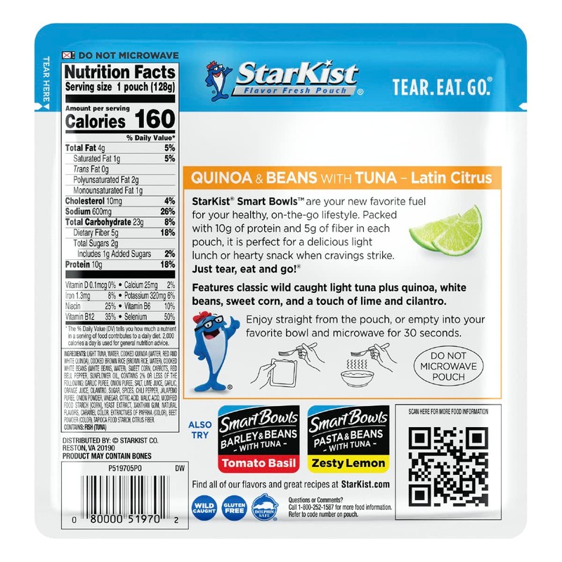 - DELICIOUS: StarKist Smart Bowls Latin Citrus features quinoa, white beans, sweet corn, and wild caught light tuna with a touch of lime and cilantro for a satisfying blend of deliciously unique flavors.