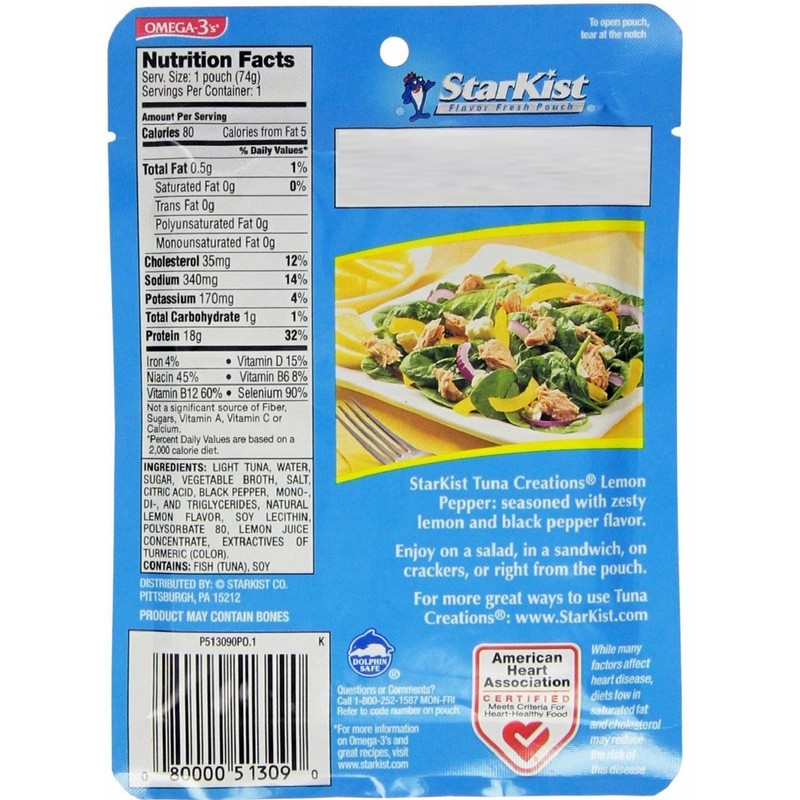 Tuna Creations Lemon Pepper adds a tangy citrus punch to meals or appetizers. Under 100 calories, this pouch features select cuts of premium chunk light tuna seasoned with zesty lemon and black pepper flavor. It’s perfect in pasta salads and sandwiches - or put it on crackers for a quick snack! Tuna is naturally high in protein. StarKist Tuna Creations, Lemon Pepper contains 200mg per serving of EPA and DHA Omega-3s combined, which is 125% of the 160mg Daily Value for a combination of EPA and DHA.