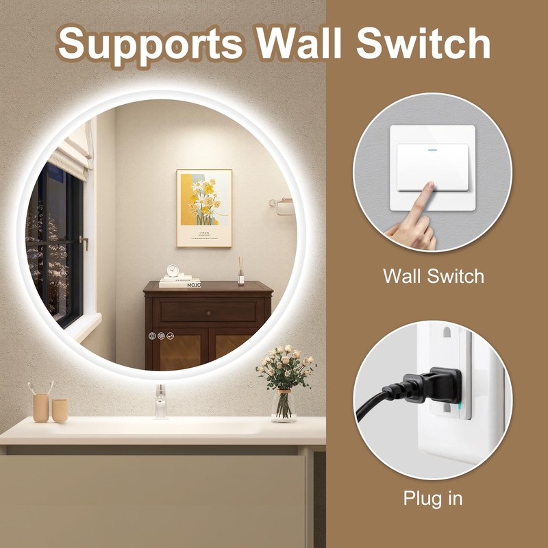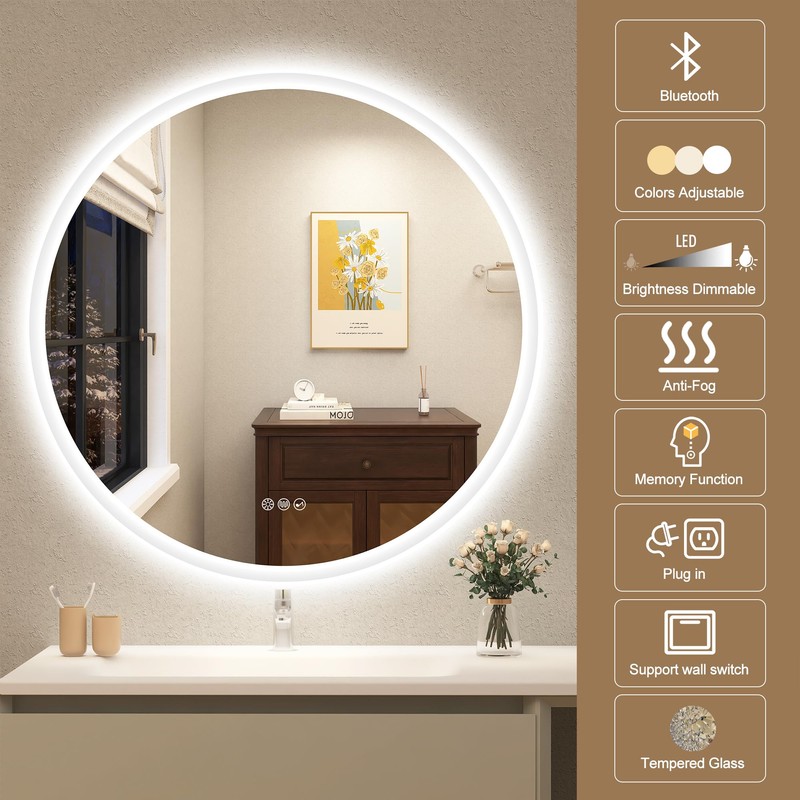 Our smart bathroom lighting LED mirrors could meet all your needs. The high-quality frameless silver mirror gives you the ultimate experience of using it. Our round illuminated mirror controls many functions with one smart button: automatically turn on the Bluetooth function, control the light on/off and brightness, and the defogging function on. Create a comfortable environment for you to enjoy music while enjoying high definition lighting. Elegant modern minimalist design is suitable for hanging in various scenes: bathroom, bedroom, hair salon, etc. Specifications: