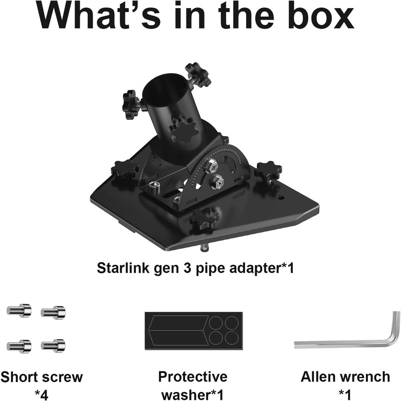 - This Starlink Gen 3 mounting kit includes all necessary accessories and detailed instructions, ensuring a simple installation process. Whether you're a beginner or an expert, you can set it up effortlessly without specialized tools or external help.