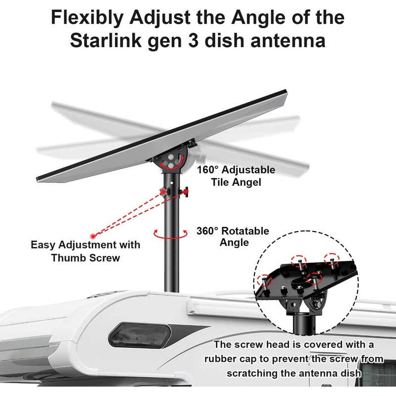 - 【Flexible Angle Adjustment】: This Starlink gen 3 pole mount adapter features flexible angle adjustment, allowing you to easily align with the Starlink internet satellite direction for optimal network signal. The adjustable tilt angle reaches up to 160°, with a horizontal rotation of 360°. This enables you to find the perfect signal reception position in any environment. Say goodbye to unstable signals and enjoy a high-quality internet experience, staying connected with high-speed access anytime, anywhere!