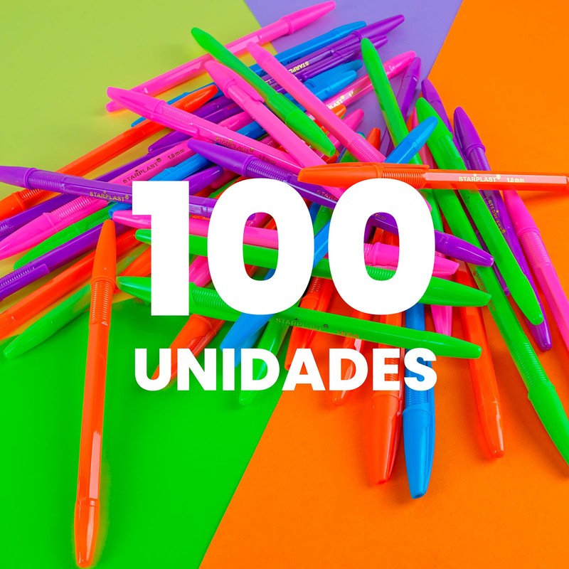 Starplast Pack of 100 Ballpoint Pens with Cap, 5 Fluorescent Colours, Blue Ink, 100 Pieces, Non Slip Ballpoint Pens with Presentation Box for School or Office