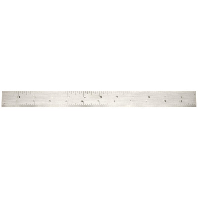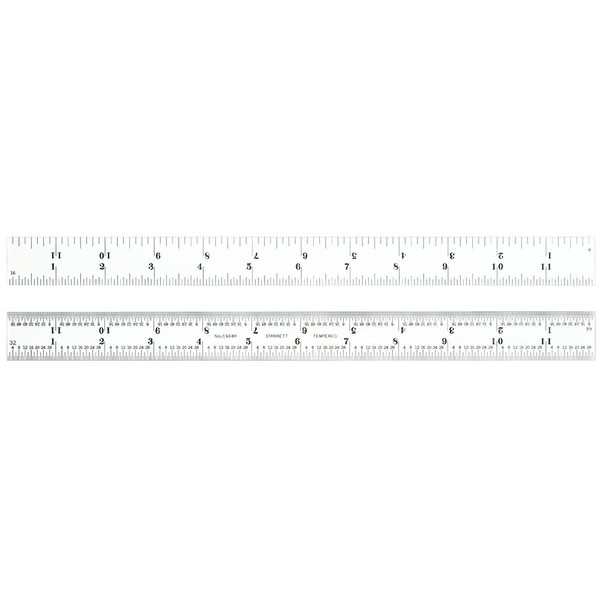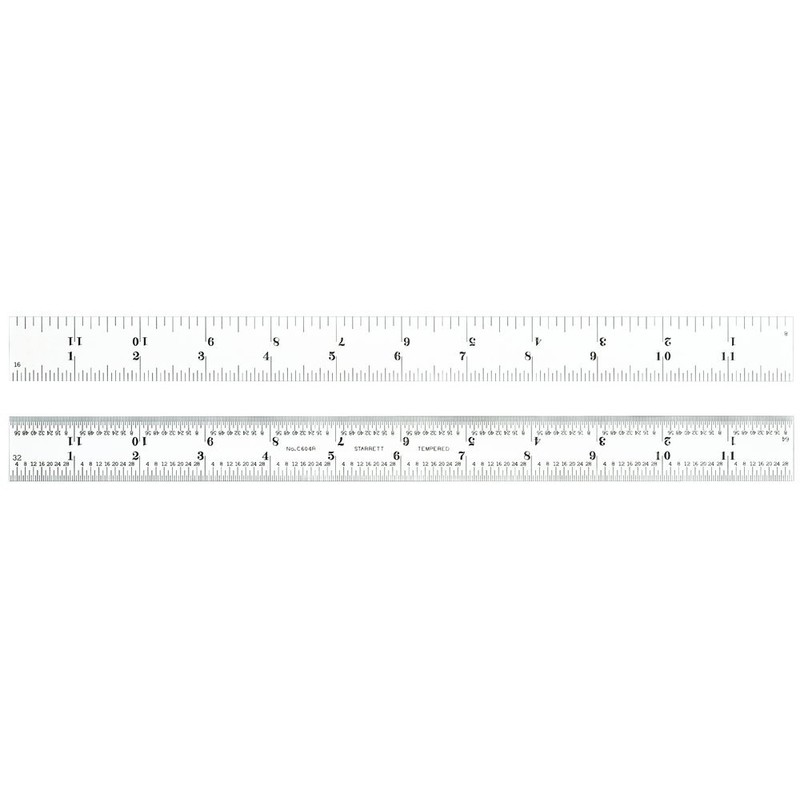 Starrett 12" spring-tempered steel rules with Inch graduations feature a satin chrome finish. Graduations at 8ths, 16ths, quick-reading 32nds, 64ths. Features single row of inch figures.