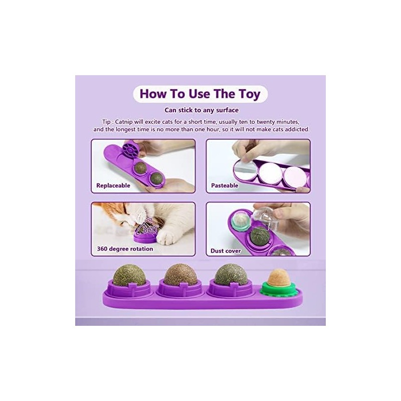 - Practical Design The 360 degree rotating design brings endless happiness for cats. The transparent dust cover prevents dust while preventing the loss of mint smell. There is a double-sided sponge tape at the bottom, which can be applied to walls, table corners and other places.