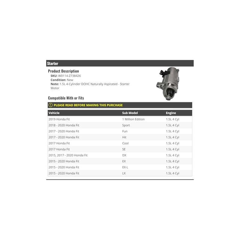 - Compatible with or fits: 2015, 2017 - 2020 Honda Fit DX 1.5L 4 Cyl | 2015 - 2020 Honda Fit EX 1.5L 4 Cyl
