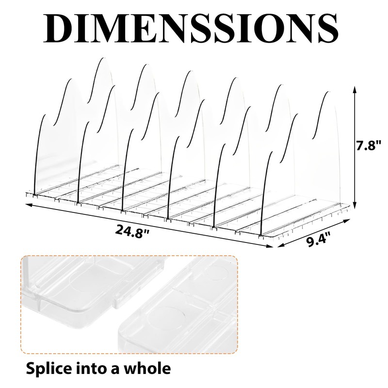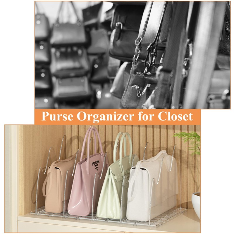 - PACKAGE INCLUDES: You will receive a set of acrylic purse organizer for closet, each set includes two sets, each set has 4 dividers. Two sets of shelf dividers can be connected together to accommodate different sized purses
