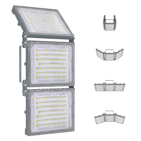 - Flexible Triple-Head Adjustment for Custom Lighting: Featuring three adjustable light heads, this floodlight allows for customized beam angles. The outer heads adjust up to 280° for wide-area illumination, while the inner head adjusts up to 150° for a more focused beam, reducing glare on sports fields and minimizing disturbances in public areas