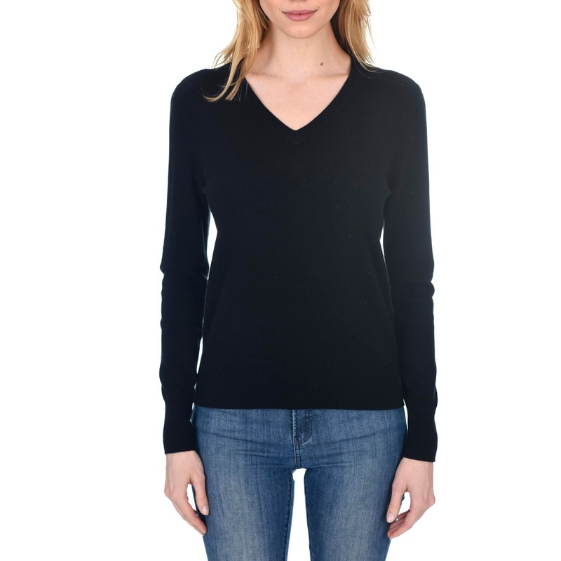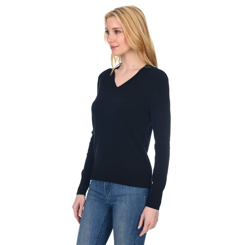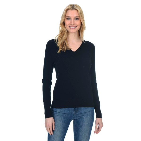 State Fusio Women's Basic V-Neck Sweater 100% Merino Wool Classic Long Sleeve Pullover (Black, Medium)