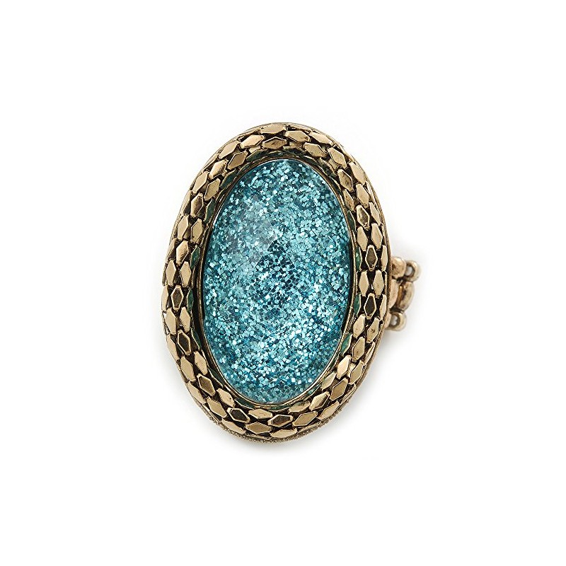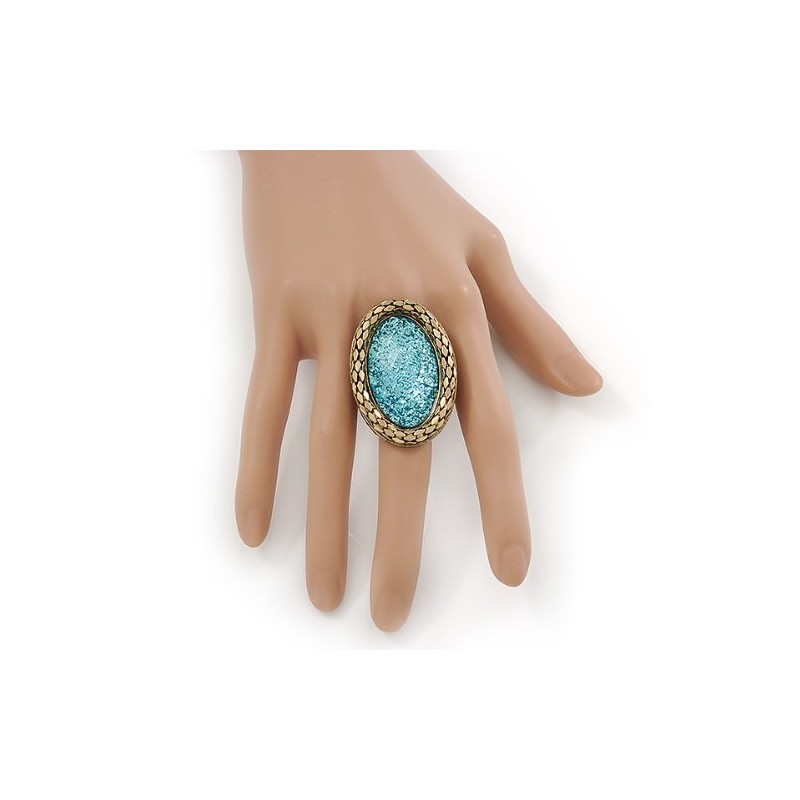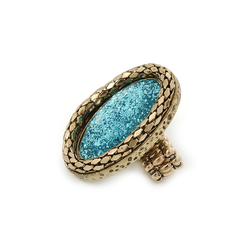 Statement Light Blue Glitter, Oval, Mesh Flex Ring In Burnt Gold Tone - 43mm Across - Size7/8