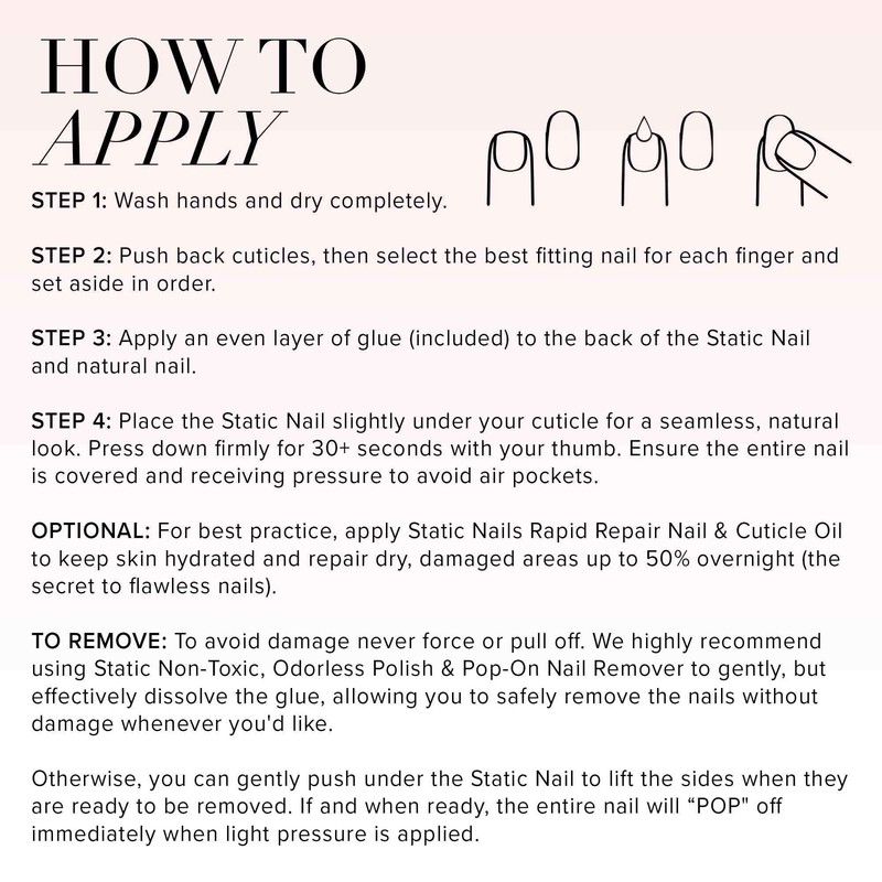 - EASY APPLICATION - Simply apply an even layer of glue (included) to the back of the Static Nail and your natural nail. Align the Static Nail with your cuticle then press down firmly for 30+ seconds using your thumb. Ensure your entire nail is covered and receiving pressure to avoid air pockets and increase wear time.