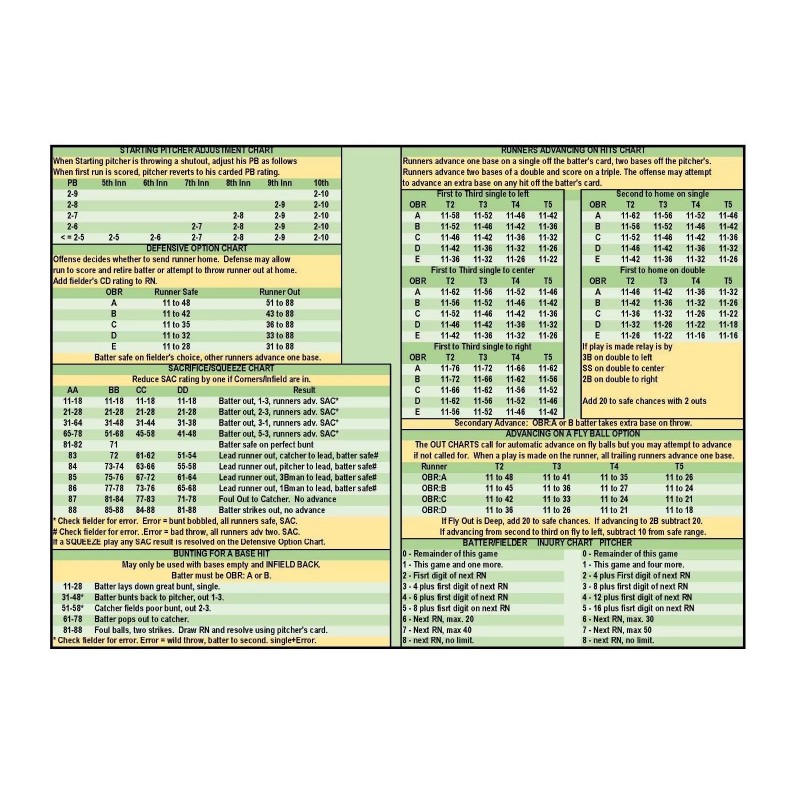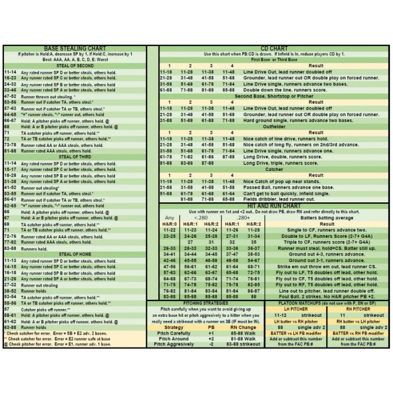 5.NewCharts:A new Steal chart set up justlike the original takes into account the steal percentage of baserunners aswell as the hold ability of the pitcher.New CD chart eliminates “No Results”, makes defense more important of aconsideration in your lineup.Defensiveratings, including Arms, are based on the most modern stats available.The Hit and Run Chart remains in the samestyle but the batters batting average is now taken into consideration.No more turning that .180 hitting 2Bman intoa .400 hitting menace with a runner on 1st.