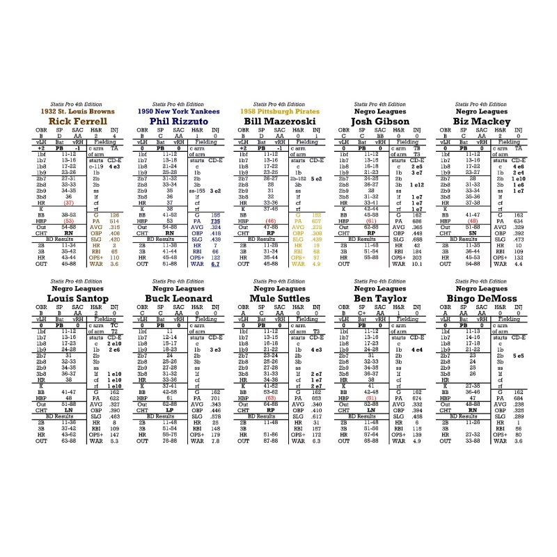 Baserunning and Fielding ratings use more subjective and reputational sources (SABR Biography project, MLB Negro League profiles, National Baseball Hall of Fame) than my normal seasons would rely on, but often that was the best available information. Those sources coupled with available statistics from Baseball Reference, Baseball Gauge and Seamheads Negro League Database provide a reasonable basis for the player ratings presented.
