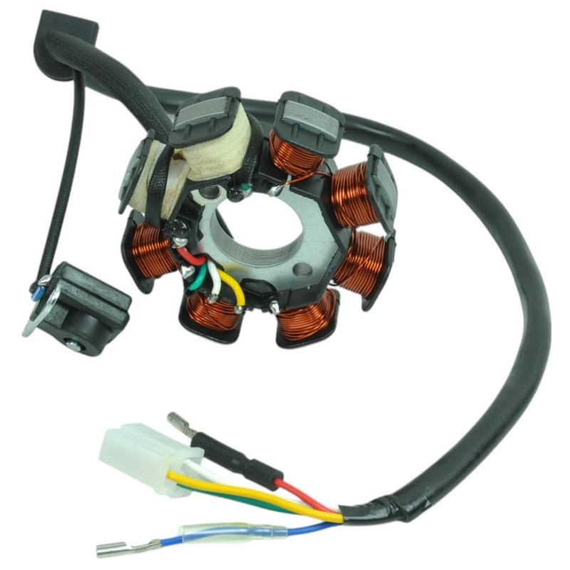 Pole Count: 8 Bullet Connector: 2 Female Connector Housing: 3-position Male Connector Housing Pin Count: 3 Pickup Bolt Spacing: 34mm (center-to-center) Stator Bolt Spacing: 40mm (center-to-center) Stator Depth: 27mm Stator OD: 88mm Common applications include: Baja Retro 150, Retro 50, Sun City 150, Sun City 50 BMS Federal 50, Tuscan 50 Coolster 50 F1, 50 F2, 50 F3 Ice Bear Bandit (PMZ50-10), BULLSEYE PST50-14, ELF PST50-16, Fury (PMZ50-14), MADDOG PMZ50-19 50, MINI CRUZZER PST50-9, MOJO PST50-8 50, PLUTO PST50-5, PMZ50-20, PMZ50-6, PMZ50-6F, Q6 PST50-17, Rocket (PMZ50-4(Yongfu)), Rocket (PMZ50-4J), Shadow (PMZ50-1) Jonway Gator 50 YY50QT-10 (4-stroke), Gator 50 YY50QT-29, Gator 50 YY50QT-3, Gator 50 YY50QT-5 (4-stroke), Gator 50cc Gator 50-E2 (YY50QT-21) (4-stroke), Gator 50cc Gator 50-S2 (YY50QT-6 ) 4-stroke Lance Cabo 50, Cali Classic 50, Havana Classic 50, PCH 50, Soho 50 Peace Sports 50 TPGS-801-50, 50 TPGS-802, 50 TPGS-803, 50 TPGS-804-50 FUTURE, 50 TPGS-809 BLX, 50 TPGS-810, 50 TPGS-811, 50 TPGS-812, 50 TPGS-824 Ruckus, 50 TPGS-827, 50 TPGS-829, 50 TPGS-830, 50 TPGS-831, 50 TPGS-840, Nightsky 50 Qingqi 50 QM50QT-10A, 50 QM50QT-10E, 50 QM50QT-2 FIZZ 4-stroke, 50 QM50QT-2G LEOPARD 4-stroke, 50 QM50QT-2M 4-stroke, 50 QM50QT-6D KOALA 4-stroke, 50 QM50QT-6F 4-stroke RedStreak Eco 50, Eco II 50, Glide 50, M80 50, Metro Duo 50, Metro Retro 50, Sport R 50, Xtreme 50 Roketa Bahama 150 MC-07, Bahama 50 MC-07 50, Maui 50 MC-08, Sicily 50 MC-17 50 Schwinn CAMPUS 50 (4 Stroke), COLLIGIATE 50, GRADUATE 50, HOPE 50, LAGUNA 50, SPORT 50, VALO 50 Sunl 50 SL50QT-2, 50 SL50QT-6, 50 SL50QT-7 Tank 50 URBAN 50, 50 URBAN CLASSIC 50, 50 URBAN ECONO 50, 50 URBAN SPORTY 50 TaoTao ATM50A1 50, New Speed 50, Speed 50 Vento Phantera Base (4 Stroke), Phantera GT5 (4 Stroke), Phantom Gt5 (4 Stroke), Phantom LI (4 Stroke), Phantom r4i (4 Stroke), Phantom R5 (4 Stroke), Triton LI (4 Stroke), Zip LI (4 Stroke) Xtreme XM-50