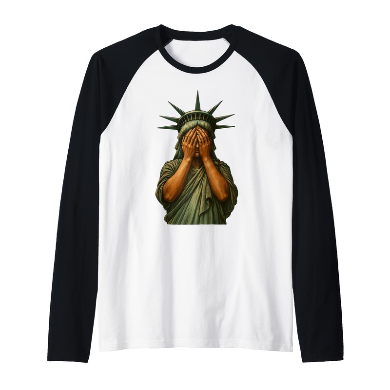 Statue of Liberty Face covering in shame political Satire Raglan Baseball Tee
