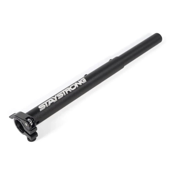 DESCRIPTION: STAY STRONG BMX RACING WARMDOWN SEAT POST EXTENDER - 22.2mm dia - 350mm. Color: Black with white logos. This item is brand new and never used or mounted. The Stay Strong seat post extender removes the need for another seat and post