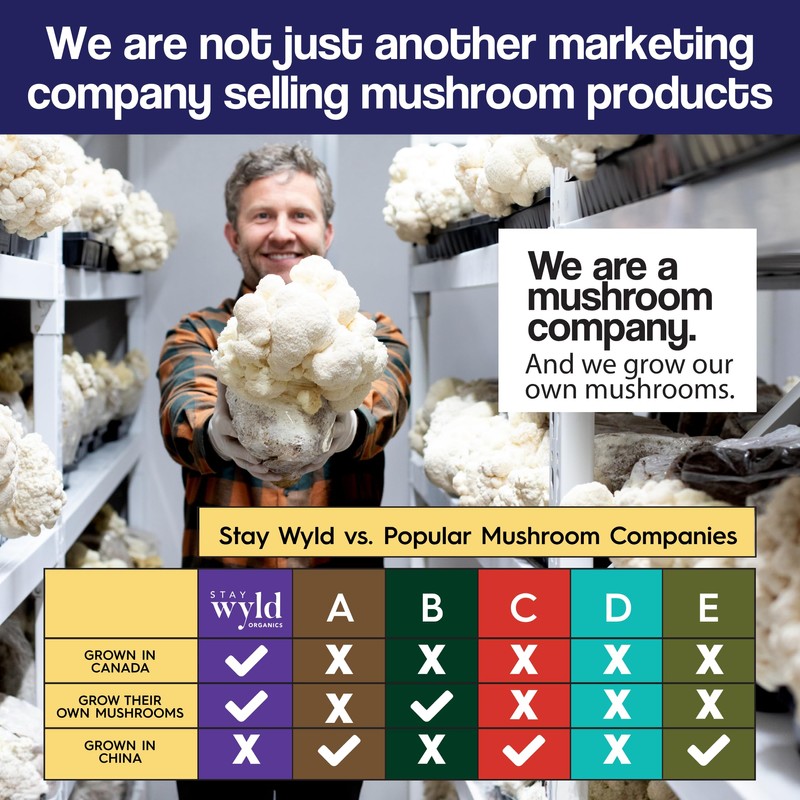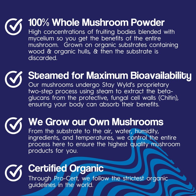 - LOCALLY-SOURCED & COMMITTED TO NATURE: Staying Wyld is a state of mind fueled by the extensive benefits of mushrooms. We grow our organic mushrooms on our mushroom farm in Pemberton, BC, with strict controls on our product. We also steam extract our mushrooms to maximize their bio-availability, nutrients and benefits. Finally, we put the environment first by being 100% Plastic Free. Stay Wyld Organics mushroom supplements are Gluten-free, Non-GMO, Vegan, and contain no mercury.